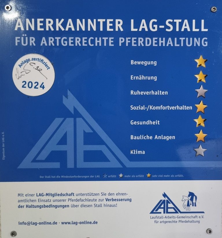 Wir sind ein LAG Zertifizierter Stall und das bereits seit über 10 Jahren. Uns ist es ein großes Anliegen, weit über das Maß und die Norm